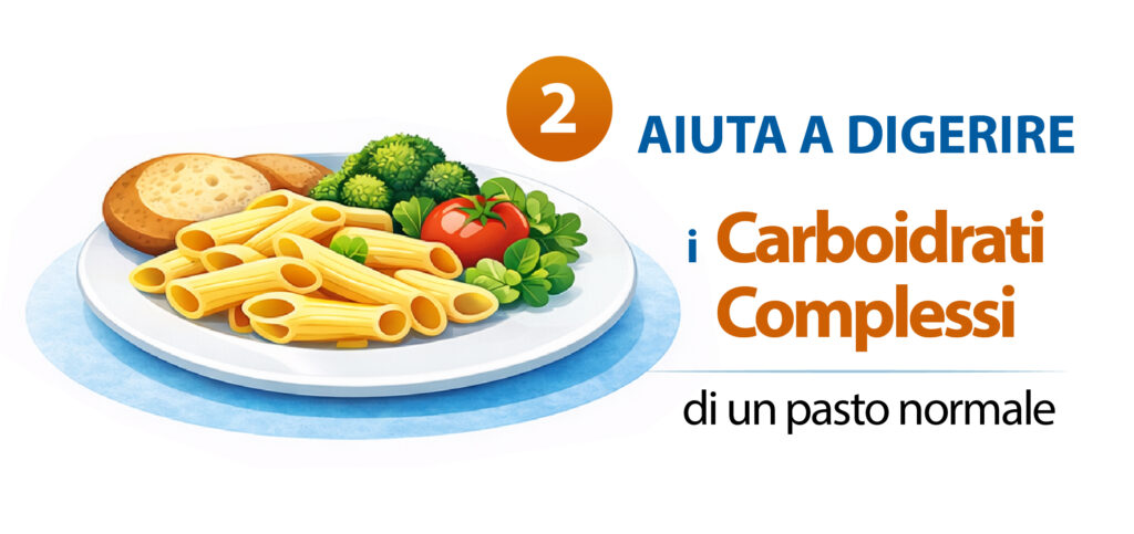 L’Alfa-galattosidasi favorisce la digestione dei carboidrati complessi presenti in alcuni alimenti, riducendo i processi fermentativi e la produzione di gas.